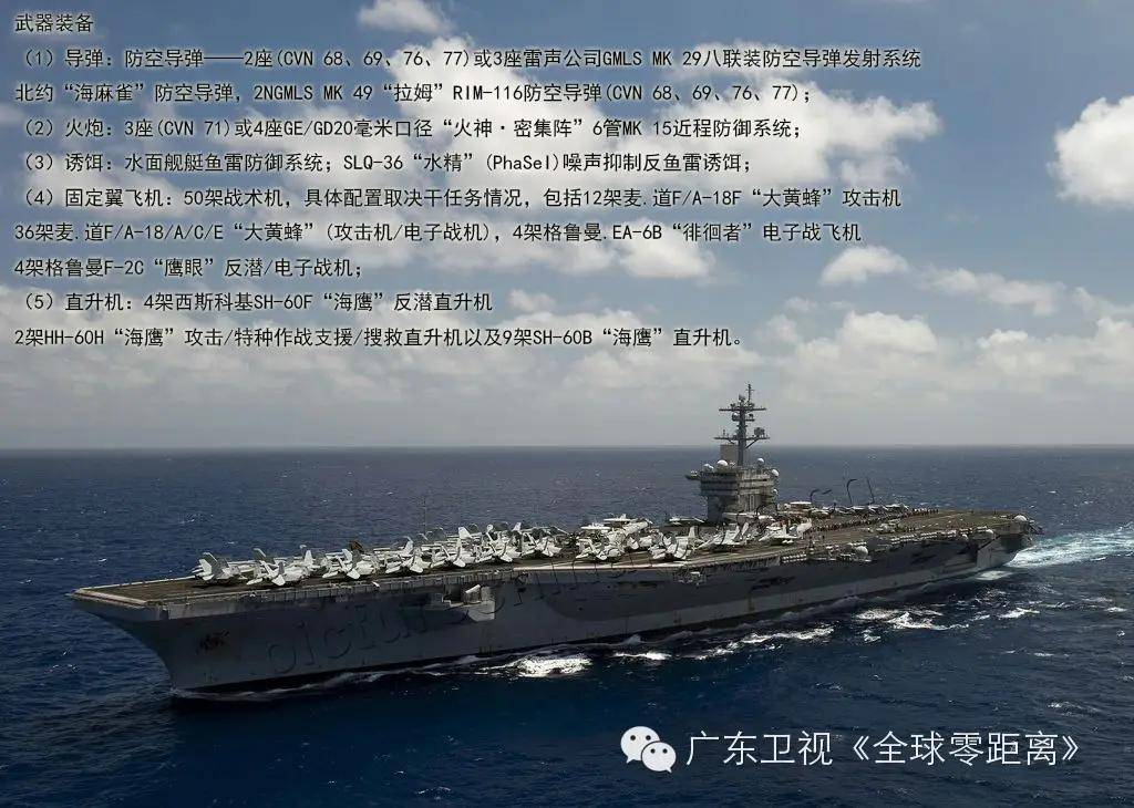 尼米兹”级航空母舰是美国第二代核动力航空母舰,也是当今世界上最大的航空母舰,它的7种不同用途的舰载飞机可以对敌方飞机、船只、潜艇和陆地目标发动攻击,可以支援陆地作战,保护海上舰队,可以在航空母舰周围方圆几百海里的海面上布雷,实施海上封锁。由它领衔组成的战斗群通常由4~6艘导弹巡洋舰、驱逐舰、潜艇和补给舰只构成。