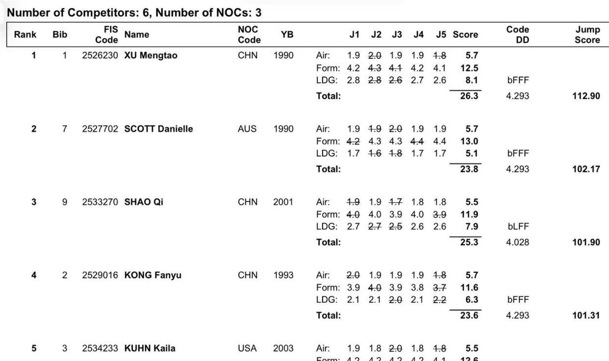 斯科特在第一轮曾跳出117.19分的超高分数,是夺冠的热门人选。 当她站上起跳台时,整个赛场的气氛都紧张到了极点。 然而在落地时,斯科特出现了明显的瑕疵,臀部着地,手触雪面。 尽管这样,裁判还是给出了102.17分。 这个分数让她超越了邵琪和孔凡钰,拿到了银牌。 徐梦桃以超过10分的巨大优势成功卫冕,邵琪获得铜牌,孔凡钰以0.59分之差遗憾位列第四。