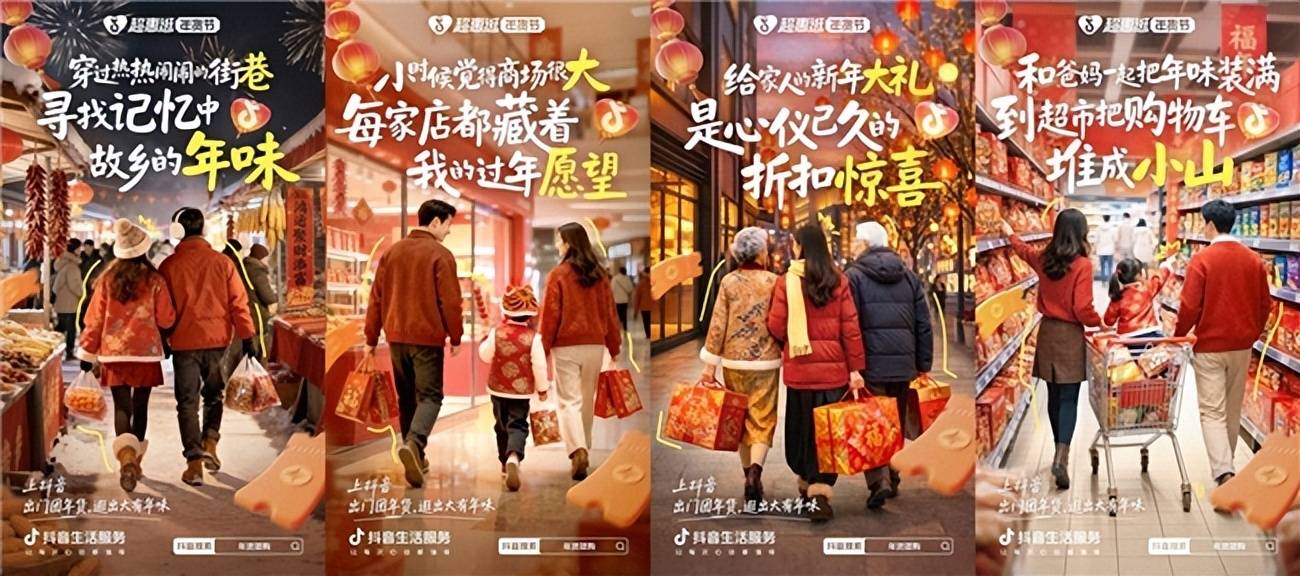 线上通过多维内容造势,引爆全域流量。基于北方用户新春情感需求,设计“北方办年货的专属记忆”等系列年味情绪海报,通过抖音站内等渠道精准投放,强化活动认知。