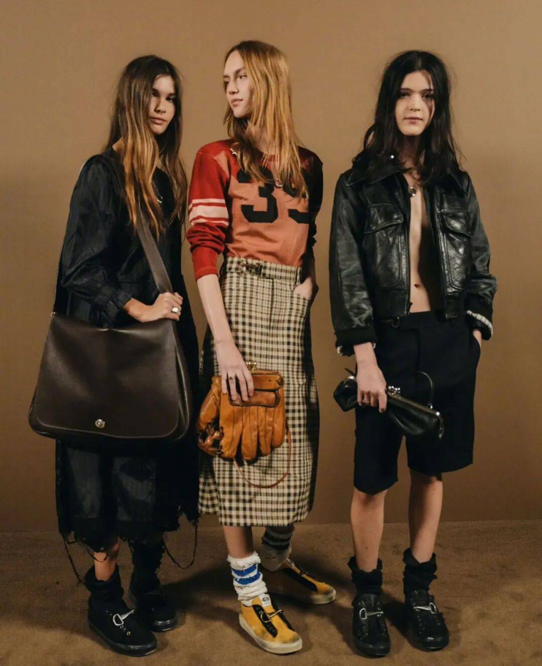 本季重点造型包括反转穿法的西装外套、刻意错位的领带,以及搭配磨损百慕达短裤的厚实Grunge格纹。Vevers以高筒滑板球鞋及缀有星辰胸针的缎面高领连身裙,勾勒出略带叛逆的「Back to School」氛围。此外,外套设计依然是品牌的核心支柱,今季大秀带来多款经典Varsity Jacket 的全新演绎。